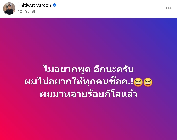 โดย ผู้ใหญ่บ้านฟินแลนด์ ได้ออกมาโพสต์ข้อวามสั้นๆ ว่า “ไม่อยากพูด อีกนะครับ ผมไม่อยากให้ทุกคนช๊อค.! ผมมาหลายร้อยกิโลแล้ว” ด้านแฟนคลับไม่รอช้า แห่เข้ามาคอมเมนต์ถามสนั่นหลังจากที่เห็นโพสต์ดังกล่าว