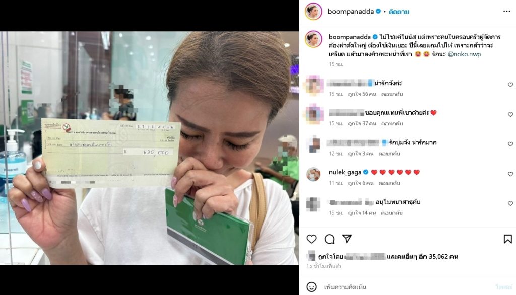 โดย บุ๋ม ปนัดดา ได้ออกมาโพสต์ภาพของผู้จัดการส่วนตัว ที่กำลังถือเช็คมูลค่า 630,000 บาท ด้วยท่าทีสุดซึ้งใจ พร้อมกับเขียนข้อความระบุเอาไว้ด้วยว่า “ไม่ใช่แค่โบนัส แต่เพราะคนในครอบครัวผู้จัดการต้องผ่าตัดใหญ่ ต้องใช้เงินเยอะ ปีนี้เลยแถมไปให้ เพราะกลัวว่าจะเครียด แล้วมาลงคิวกระหน่ำที่เรา รักนะ”