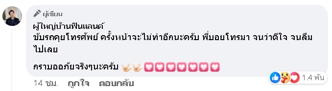 งานนี้ด้าน ผู้ใหญ่บ้านฟินแลนด์ ไม่รอช้า รีบออกมาเขียนข้อความขอโทษทันทีว่า “ขับรถคุยโทรศัพท์ ครั้งหน้าจะไม่ทำอีกนะครับ พี่บอยโทรมา จนว่าดีใจ จนลืมไปเลย กราบออภัยจริงๆ นะครับ”