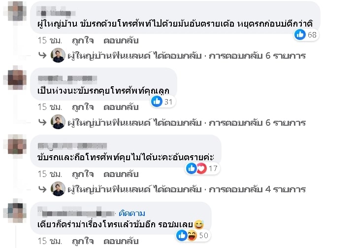 ล่าสุด ผู้ใหญ่บ้านฟินแลนด์ ได้ออกมาโพสต์คลิปหลังจากที่หมอลำชื่อดังอย่าง แอน อรดี และ บอย ศิริชัย ที่ได้วิดีโอคอลหาเพื่อส่งกำลังใจให้ พร้อมเขียนแคปชั่นเอาไว้ว่า “แอนอรดีและบอยศิริ โทรมาพูดอะไรกับผู้ใหญ่บ้านฟินแลนด์พร้อมให้กำลังใจ” แต่งานนี้ทำเอาแฟนคลับแห่เป็นห่วงหนัก เพราะเป็นจังหวะที่ ผู้ใหญ่บ้านฟินแลนด์ ได้ขับรถไปด้วยและได้พูดคุยโทรศัพท์ไปด้วย จนด้านของแฟนคลับหวั่นเกิดอันตราย และหลายคนพากันเข้ามาคอมเมนต์แสดงความเป็นห่วงอย่างมากมาย เช่น ผู้ใหญ่บ้าน ขับรถด้วยโทรศัพท์ไปด้วยมันอันตรายเด้อ หยุดรถก่อนบ่ดีกว่าติ , หยุดรถแล้วค่อยคุยโทสับเด้อหล่า มันอันตราย , จอดรถก่อนค่อยคุยเป็นห่วงๆๆๆๆๆๆ , ขับรถระวังนะคะ.ขับรถอยู่อันตรายจ้า เป็นต้น