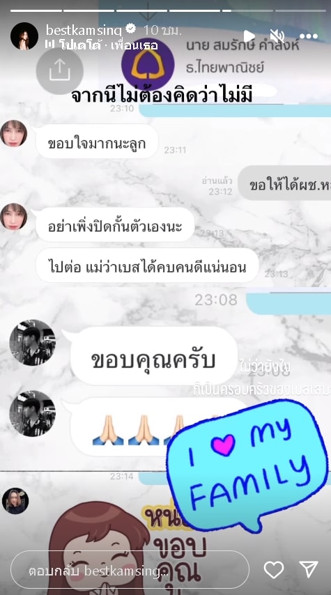 ขณะที่คุณแม่ของสาวเบสท์ ก็ได้ส่งข้อความกลับมาอวยพรลูกสาวด้วยว่า “ขอบใจมากนะลูก อย่างปิดกั้นตัวเองนะ ไปต่อ แม่ว่าเบสท์ได้คบคนดีแน่นอน” ซึ่งด้านเบสท์ ก็ได้ตอบกลับไปด้วยว่า “ขอให้ได้ผู้ชายหล่อ” อีกด้วย พร้อมเขียนแคปชั่นสุดซึ้งระบุเอาไว้ในสตอรี่ไอจีด้วยว่า “ไม่ว่ายังไง ก็เป็นครอบครัวของเบสท์เสมอ”