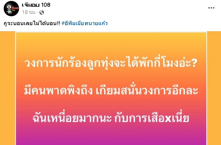 โดยเพจดังอย่าง เจ๊มอย 108 ได้ออกมาโพสต์ภาพที่มีข้อความทิ้งบอมบ์ผ่านแฟนเพจว่า “วงการนักร้องลูกทุ่งจะได้พักกี่โมงอ่ะ ? มีคนพาดพิงถึง เกียมสนั่นนวงการอีกละ ฉันเหนื่อยมากนะ กับการเxือกเนี่ย” พร้อมเขียนแคปชั่นเอาไว้ด้วยว่า “กูจะนอนเลยไม่ได้นอน!! #อิพิมเมียทนายแก้ว