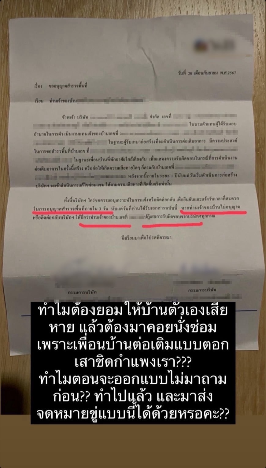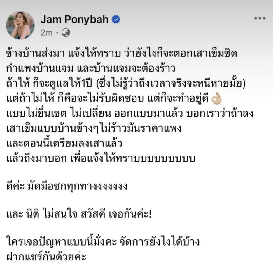 โดยสาว แจม เนโกะจัมพ์ ได้ออกมาโพสต์ข้อความสอบถามผู้รู้หลังเธอได้รับเอกสารจากบริษัทผู้รับเหมาก่อสร้างของเพื่อนบ้าน ขอเข้าสำรวจพื้นที่บ้านเพื่อต่อเติมอาคาร แต่ทำเอาเจ้าตัวหัวร้อนไม่พอใจหนักมาก เมื่อเอกสารที่ส่งมาดูเหมือนจะเป็นการมัดมือชกชัดๆ ซึ่งสาว แจม ได้โพสต์ภาพเอกสารดังกล่าว พร้อมกับระบุแคปชั่นไว้ว่า “ข้างบ้านส่งมา แจ้งให้ทราบ ว่ายังไงก็จะตอกเสาเข็มชิดกำแพงบ้าน แจม และบ้าน แจมจะต้องร้าว ถ้าให้ ก็จะดูแลให้ 1 ปี (ซึ่งไม่รู้ว่าถึงเวลาจริงจะหนีหายมั้ย) แต่ถ้าไม่ให้ ก็คือจะไม่รับผิดชอบ แต่ก็จะทำอยู่ดีแบบไม่ยื่นเขต ไม่เปลี่ยน ออกแบบมาแล้ว บอกเราว่าถ้าลงเสาเข็มแบบบ้านข้างๆไม่ร้าวมันราคาแพงและตอนนี้เตรียมลงเสาแล้วแล้วถึงมาบอก เพื่อแจ้งให้ทราบบบบบบบบบดีค่ะ มัดมือชกทุกทางงงงงงงและ นิติ ไม่สนใจ สวัสดี เจอกันค่ะ! ใครเจอปัญหาแบบนี้มั่งคะ จัดการยังไงได้บ้างฝากแชร์กันด้วยค่ะ”