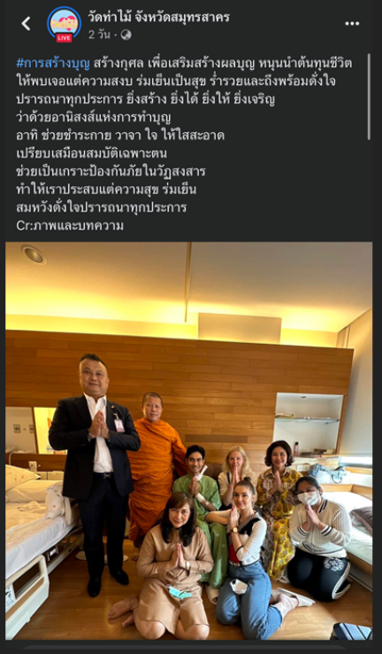 โดยมีข้อความระบุว่า “#การสร้างบุญ เพื่อเสริมสร้างผลบุญ หนุนนำต้นทุนชีวิตให้พบเจอแต่ความสงบ ร่มเย็นเป็นสุข ร่ำรวยและถึงพร้อมดั่งใจปรารถนาทุกประการ ยิ่งสร้าง ยิ่งได้ ยิ่งให้ ยิ่งเจริญ ว่าด้วยอานิสงส์แห่งการทำบุญ อาทิ ช่วยชำระกาย วาจา ใจ ให้สะอาด เปรียบเสมือนสมบัติเฉพาะตน ช่วยเป็นเกราะป้องกันภัยในวัฏสงสาร ทำให้เราประสบแต่ความสุข ร่มเย็น สมหวังดั่งใจปรารถนาทุกประการ Cr:ภาพและบทความ”