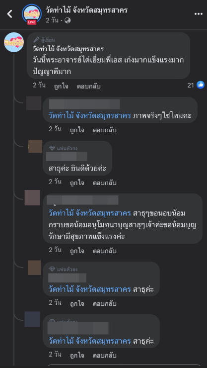 นอกจากนี้ทางแอดมิดเพจ วัดท่าไม้ จังหวัดสมุทรสาคร ยังคอมเมนต์ใต้โพสต์ดังกล่าวเพิ่มเติมด้วยว่า “วันนี้พระอาจารย์ได้เยี่ยมพี่เอส เก่งมากแข็งแรงมาก ปัญญาดีมาก”