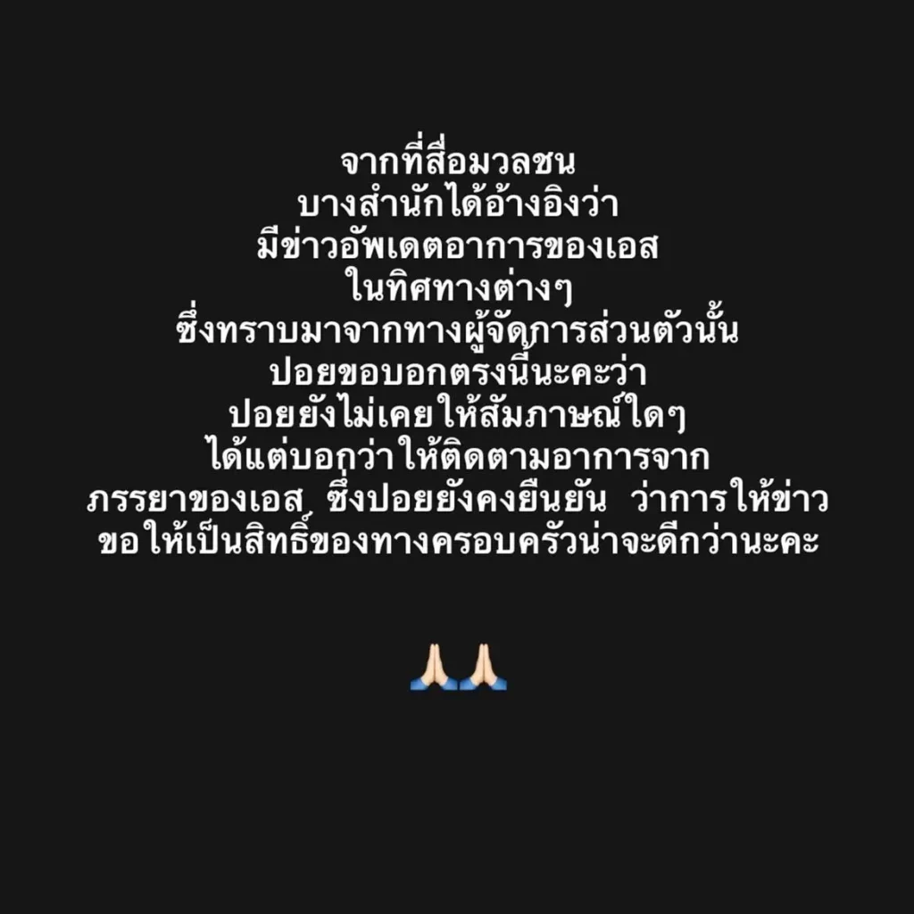 ล่าสุด ผู้จัดการ เอส ก็ได้ออกมาชี้แจงด่วน อีกทั้งยังโพสต์ภาพพร้อมระบุข้อความ ลงบนอินสตาแกรมส่วนตัวเอาไว้ว่า จากที่สื่อมวลชนบางสำนักได้อ้างอิงว่ามีข่าวอัพเดตอาการของเอสในทิศทางต่างๆ ซึ่งทราบมาจากทางผู้จัดการส่วนตัวนั้นปอยขอบอกตรงนี้นะคะว่า ปอยยังไม่เคยให้สัมภาษณ์ใดๆ ได้แต่บอกว่าให้ติดตามอาการจากภรรยาของเอส ซึ่งปอยยังคงยืนยัน ว่าการให้ข่าวขอให้เป็นสิทธิ์ของทางครอบครัวน่าจะดีกว่านะคะ