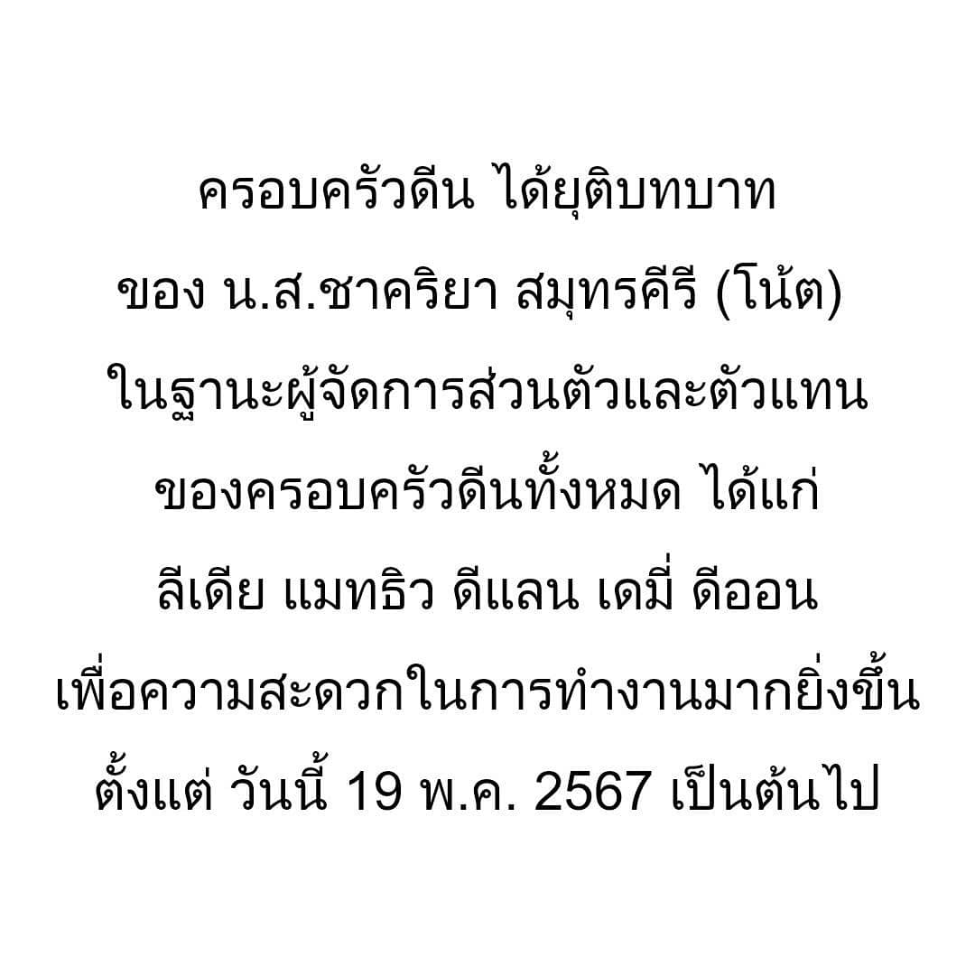 โดย ลิเดีย ศรัณย์รัชต์ ได้ออกมาโพสต์ภาพและข้อความผ่านทางอินสตาแกรมส่วนตัวเอาไว้ว่า “ครอบครัวดีน ได้ยุติบทบาทของ น.ส.ชาคริยา สมุทรคีรี (โน้ต) ในฐานะผู้จัดการส่วนตัวและตัวแทน ของครอบครัวดีนทั้งหมด ได้แก่ ลีเดีย แมทธิว ดีแลน เดมี่ ดีออน เพื่อความสะดวกในการทำงานมากยิ่งขึ้น ตั้งแต่ วันนี้ 19 พ.ค. 2567 เป็นต้นไป” ท่ามกลางแฟนๆ ที่สงสัยว่าเกิดอะไรขึ้น พร้อมกับส่งกำลังใจให้อย่างมากมาย
