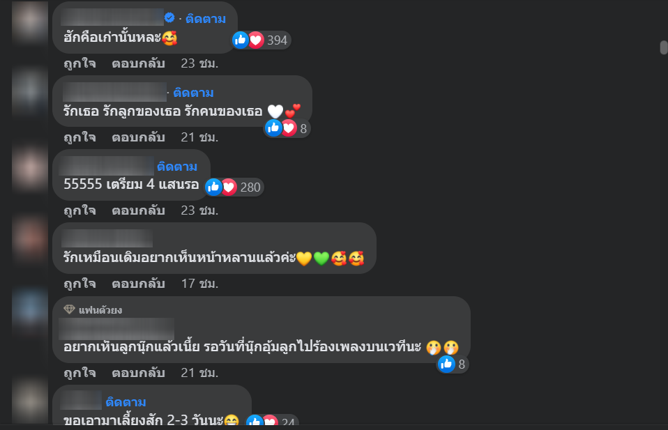ท่ามกลางแฟนๆเข้ามาตอบอย่างเร็ว อาทิ รักเหมือนเดิม เพิ่มเติม คือเปียโนไปผูกเสี่ยว ฮักคือเก่านั้นหละ รักเธอ รักลูกของเธอ รักคนของเธอ รักเหมือนเดิมอยากเห็นหน้าหลานแล้วค่ะ อยากเห็นลูกนุ๊กแล้วเนี้ย รอวันที่นุ๊กอุ้มลูกไปร้องเพลงบนเวทีนะ ขอเอามาเลี้ยงสัก 2-3 วันนะ