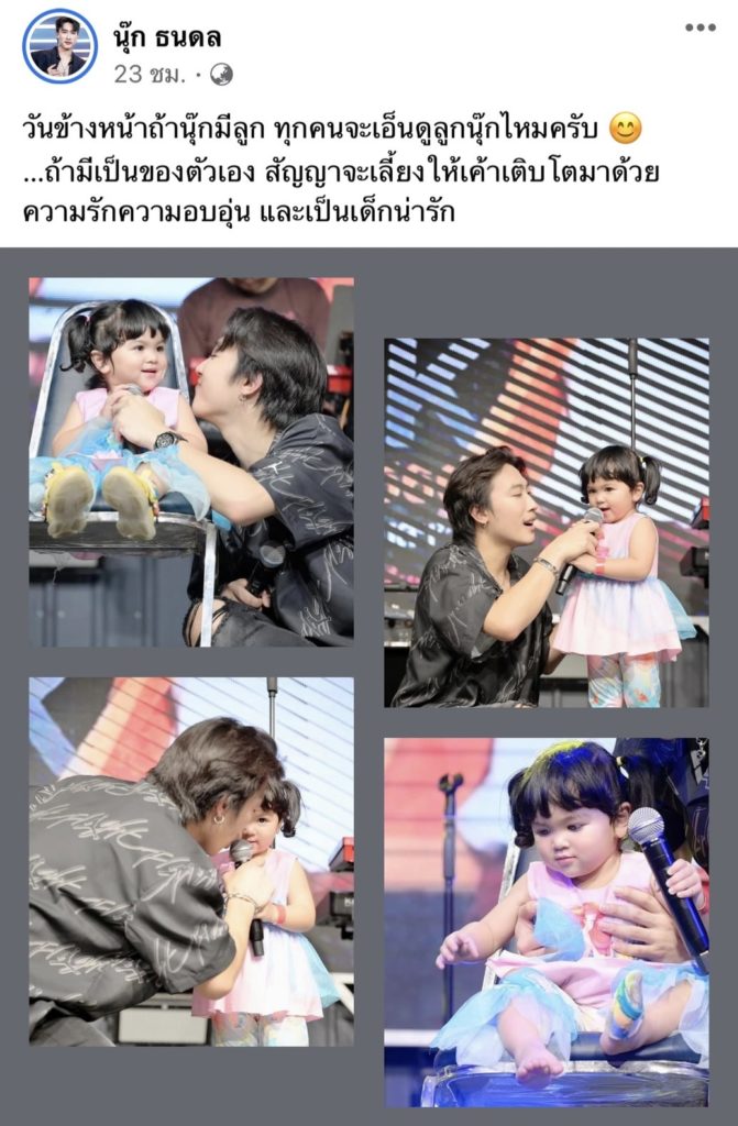 ล่าสุด นุ๊ก ธนดล ไปเล่นคอนเสิร์ตที่จังหวัดอุดรธานี ซึ่งบรรยากาศคอนเสิร์ตอบอุ่นมาก มีแฟนคลับแห่ไปให้กำลังใจมากมาย พร้อมทั้งมีแฟนคลับตัวน้อยขึ้นไปร่วมสนุกบนเวทีกับ หนุ่มนุ๊ก อีกด้วย ซึ่ง นุ๊ก ก็ได้โพสต์รูปคู่กับสาวน้อยน่ารัก มีนาม ว่า น้องเปียโน ลงในเฟซบุ๊กส่วนตัว พร้อมกับระบุข้อความ ว่า วันข้างหน้าถ้านุ๊กมีลูก ทุกคนจะเอ็นดูลูกนุ๊กไหมครับ …ถ้ามีเป็นของตัวเอง สัญญาจะเลี้ยงให้เค้าเติบโตมาด้วยความรักความอบอุ่น และเป็นเด็กน่ารัก