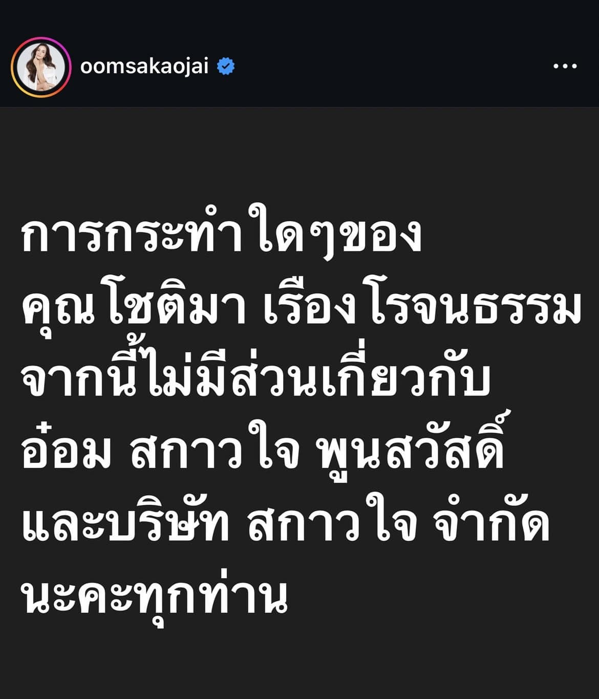 โดยนักแสดงสาว อ๋อม สกาวใจ ได้ออกมาเคลื่อนไหวบนแอ็กเคานต์อินสตาแกรมส่วนตัวของเธอเพื่อแจ้งข่าวที่ทำเอาเหล่าบรรดาแฟนคลับและผู้ติดตามของเธอต่างเห็นใจ และไม่อยากจะเชื่อว่าจะเป็นเรื่องจริง คาดเดาไปว่าดูเหมือนจะซ้ำรอยกับนักแสดงอีกหลายคนที่ออกมาถอดผู้จัดการส่วนตัว ซึ่งสาว อ๋อม ได้โพสต์ภาพพร้อมระบุข้อความว่า “การกระทำใดๆ ของ คุณโชติมา เรืองโรจนธรรม จากนี้ไม่มีส่วนเกี่ยวกับ อ๋อม สกาวใจ พูนสวัสดิ์ และบริษัท สกาวใจ จำกัด นะคะทุกท่าน” พร้อมกับเขียนแคปชั่นไว้อีกด้วยว่า “ตามนี้ค่ะ”
