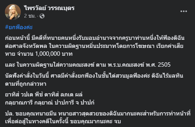 โดย แพรรี่ ไพรวัลย์ ได้โพสต์ประกาศพ้นมลทินแล้ว ลงในเฟวบุ๊กส่วนตัว ซึ่งมีข้อความ ว่า ยกฟ้องค่ะ ก่อนหน้านี้ มีคดีที่ทนายคนหนึ่งรับมอบอำนาจจากครูบาท่านหนึ่งให้ฟ้องดิฉันต่อศาลจังหวัดพล ในความผิดฐานหมิ่นประมาทโดยการโฆษณา เรียกค่าเสียหาย จำนวน 1,000,000 บาท และ ในความผิดฐานใส่ความคณะสงฆ์ ตาม พ.ร.บ.คณะสงฆ์ พ.ศ. 2505 นัดฟังคำสั่งในวันนี้ ศาลมีคำสั่งยกฟ้องในชั้นไต่สวนมูลฟ้องค่ะ ดิฉันไร้มลทินตามที่ถูกกล่าวหา