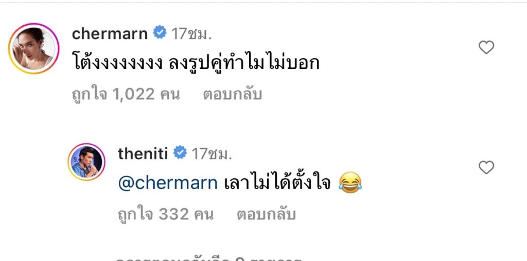 จน พลอย เฌอมาลย์ เข้ามาคอมเมนต์แซวอย่างไวว่า โต้งงงงงงงง ลงรูปคู่ทำไมไม่บอก” ซึ่งทางป๋อมแป๋มเองก็ได้เข้ามาคอมเมนต์ต่อว่า “เลาไม่ได้ตั้งใจ ทำแฟนๆฮาหนักกว่าเดิม