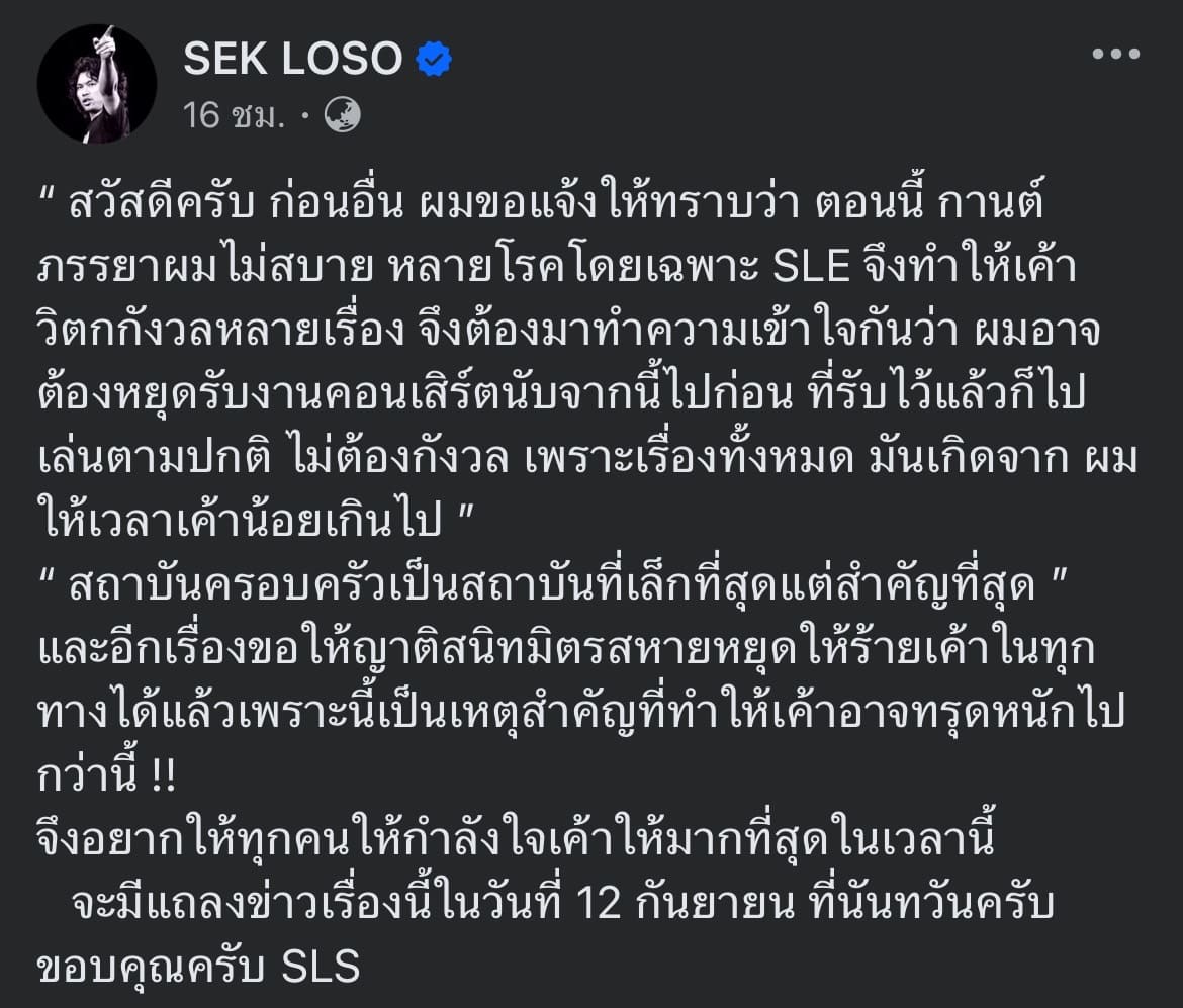 “เสก โลโซ” ออกมาประกาศหยุดรับงานคอนเสิร์ต เพื่อดูแลภรรยาที่กำลังป่วยไม่สบาย ลั่นขอญาติหยุดให้ร้ายทุกทาง หวั่นเป็นเหตุอาการทรุดหนัก