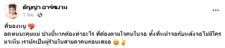 โดย ธัญญ่า อาร์สยาม ได้ออกมาโพสต์ภาพของตัวเอง และเขียนข้อความผ่านทางเฟซบุ๊กส่วนตัวว่า “ที่ของหนู อดทนนะคุมแม่ ช่วงนี้หากต้องทำอะไร ที่ต้องตามใจคนในจอ ทั้งที่หน้าจอกับหลังจอไม่มีใครมาเห็น เรามักเป็นผู้ร้ายในสายตาคนก่อนเสมอ”