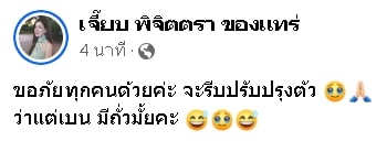 ขณะที่ เจี๊ยบ พิจิตตรา ได้แชร์โพสต์ดังกล่าว พร้อมเขียนแคปชั่นติดตลกเอาไว้ด้วยว่า “ขออภัยทุกคนด้วยค่ะ จะรีบปรับปรุงตัว ว่าแต่เบน มีถั่วมั้ยคะ และใครจะไปเที่ยวดูช่อง yt ป็อป ได้นะคะ” ด้าน พี่บอย ก็เข้ามาคอมเมนต์อีกว่า “ขายถั่วคือ บัง ไม่ใช่ เบน 555555”