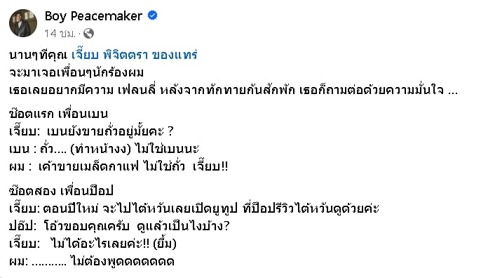 เช่นเดียวกับล่าสุด บอย พีซเมกเกอร์ ได้ออกมาโพสต์ภาพที่ได้ถ่ายรูปกับเพื่อนนักร้องและ เจี๊ยบ พิจิตตรา พร้อมเขียนเล่าความโก๊ะของภรรยาเอาไว้อย่างฮาๆ ว่า “นานๆ ทีคุณ เจี๊ยบ พิจิตตรา ของแทร่ จะมาเจอเพื่อนๆ นักร้องผม เธอเลยอยากมีความ เฟลนลี่ หลังจากทักทายกันสักพัก เธอก็ถามต่อด้วยความมั่นใจ …”