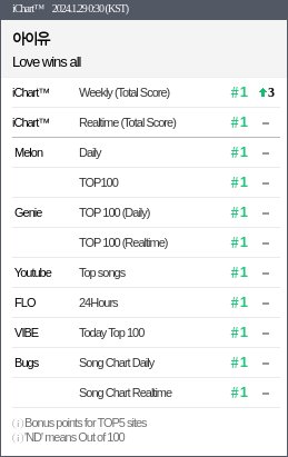 ตามข้อมูลของ Melon นับตั้งแต่การปรับโครงสร้างชาร์ตในเดือนสิงหาคม 2021 ซิงเกิล Love Wins All เป็นซิงเกิลแรกนับตั้งแต่เพลง ‘Yet To Come’ ของ BTS ที่ติดอันดับ 1 ใน ‘Top 100’ ภายในหนึ่งชั่วโมงหลังจากเปิดตัว ในช่วงสองปีที่ผ่านมา ทำให้ IU กลายเป็นศิลปินหญิงคนแรกที่เปิดตัวเพลงในอันดับ 1